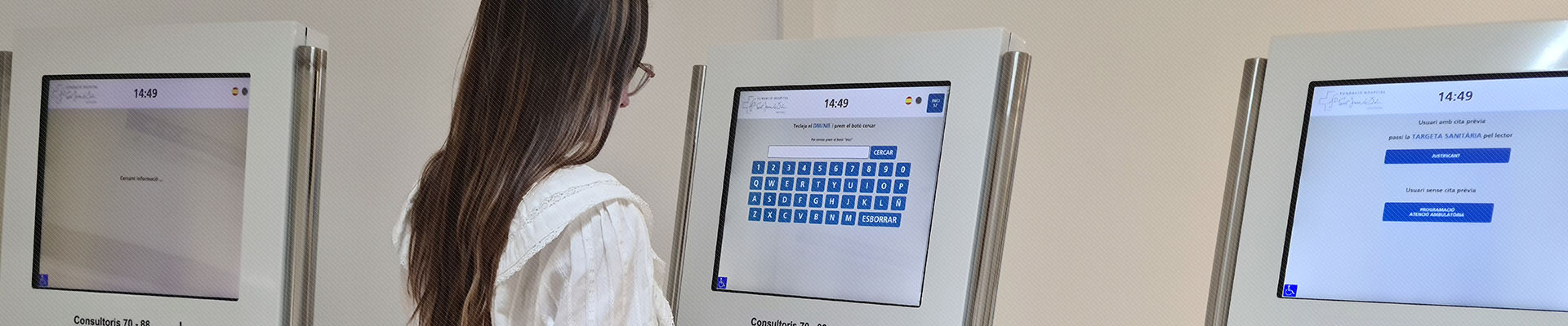 Un cop arribeu a l’hospital haureu de dirigir-vos a la màquina dispensadora de tiquets per validar la vostra arribada. Passeu la vostra targeta sanitària pel lector i s’imprimirà un tiquet que us indicarà la planta i el consultori on sereu visitats. Un cop a la sala d’espera, sereu avisats a través d’una pantalla on es mostrarà el mateix codi que teniu imprès al tiquet.